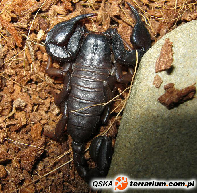 | Wygląd: | Jego ciała przybiera ciemno brązowego koloru podczas, gdy odnóża i kolec jadowy (telson) są nieco jaśniejsze. Jest to skorpion lubiący kopać wobec czego charakteryzuje się dużymi (w stosunku do całego ciała) i silnymi szczypcami, masywnym ciałem, krótkimi odnóżami oraz cienką i krótką metasomą. |